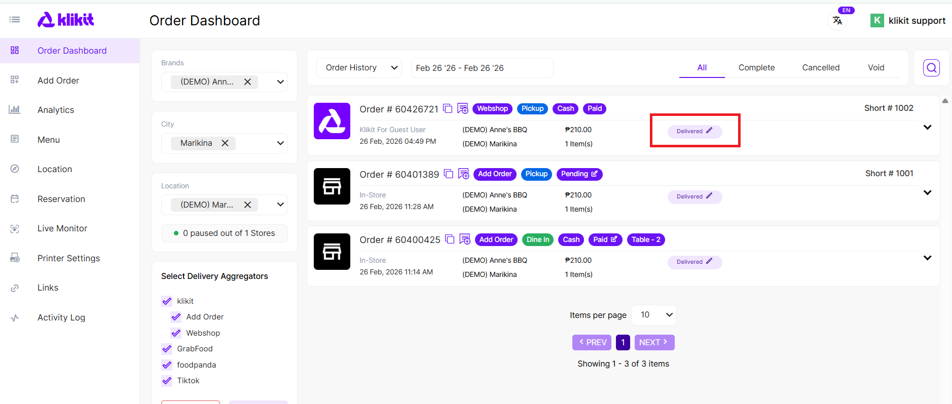 This gives greater flexibility when correcting order status mistakes directly from the klikit Order Dashboard. Updates can be done for completed orders under Order History tab, if the status can still be updated it will show a Pen icon (✏️) beside the current status. After the first update, the order can no longer be edited again