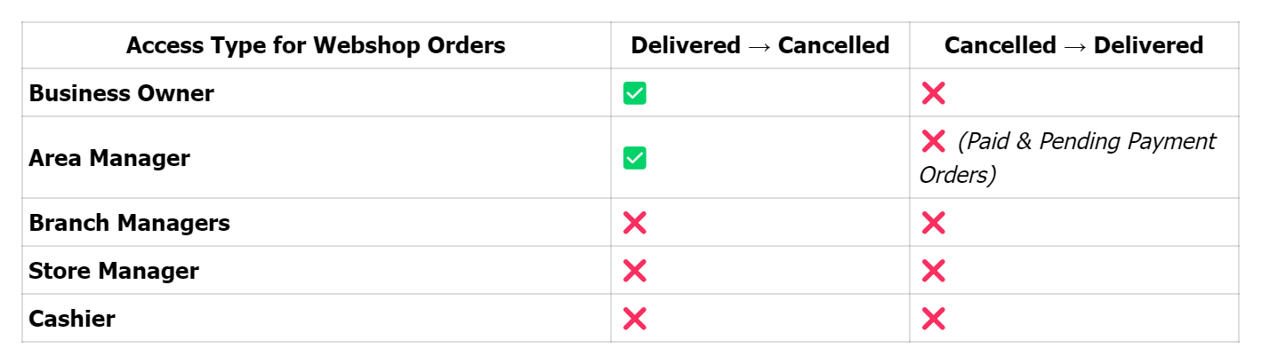 Business Owners and Area Managers can now update the status of Add Order and Webshop orders